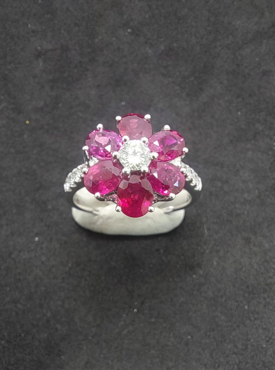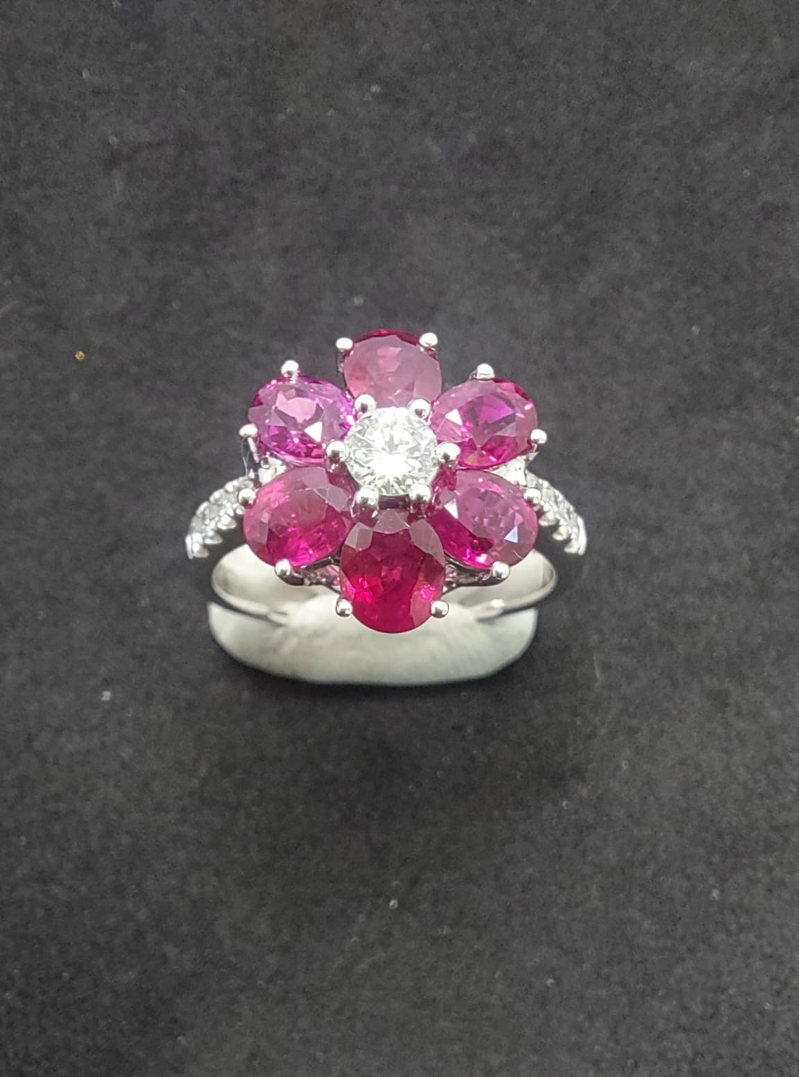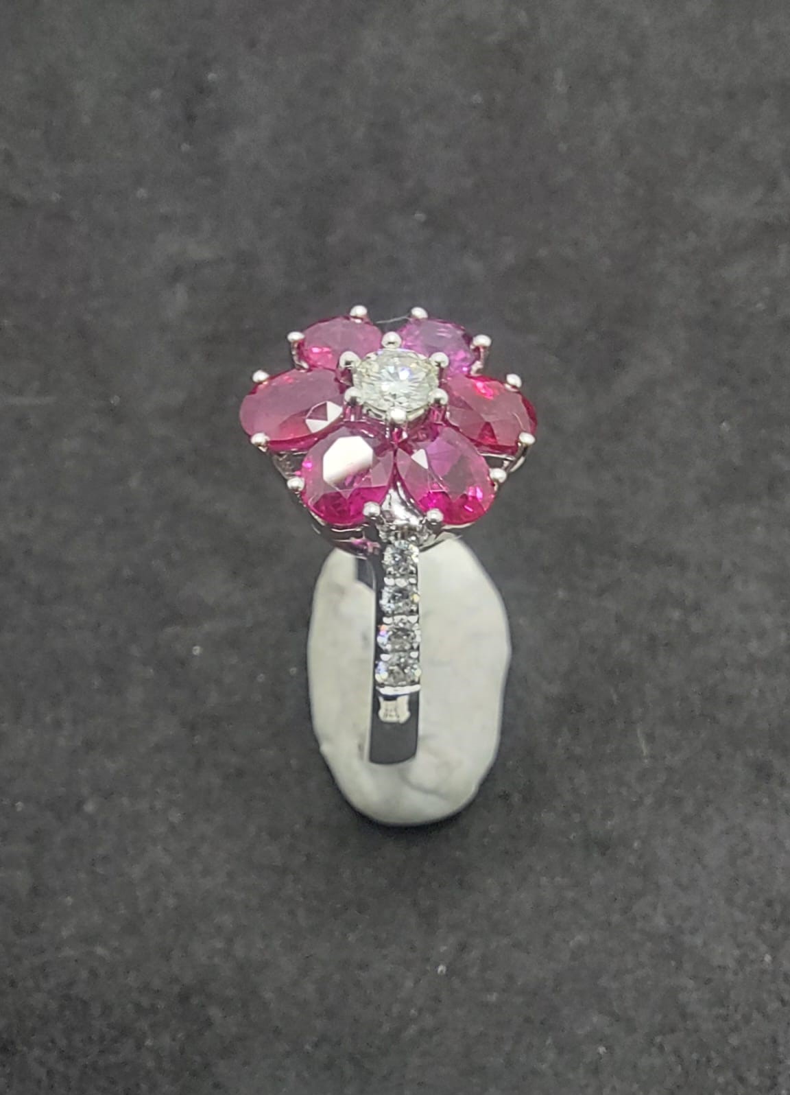 周邊裝飾:寶石周圍環繞著精緻的鑽石,增添了戒指的華麗感。