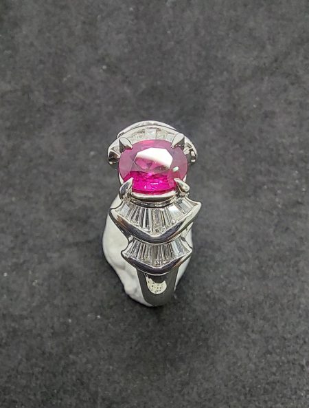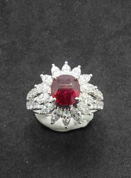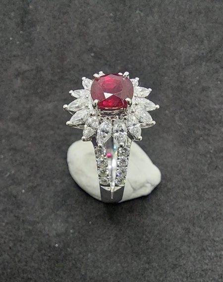 周邊裝飾:寶石周圍環繞著精緻的鑽石,增添了戒指的華麗感。