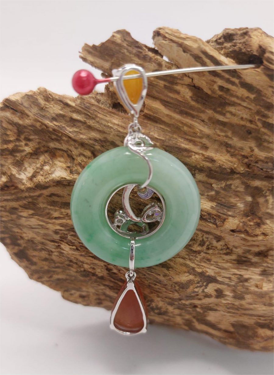 材質:主體為優質綠色翡翠,色澤飽滿,透亮自然,散發出迷人的光澤。搭配橙色和紅色的寶石增添了層次感。