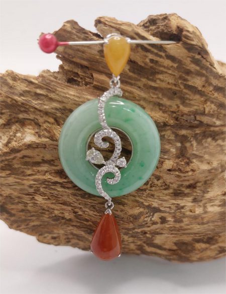 材質:主體為優質綠色翡翠,色澤飽滿,透亮自然,散發出迷人的光澤。搭配橙色和紅色的寶石增添了層次感。